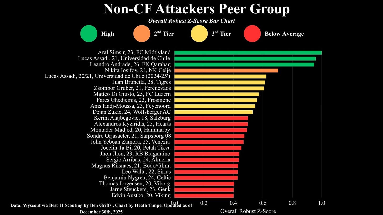 The bar chart above is a holistic view of the twenty-five Non-Centre Forward Attackers (made up of wingers and attacking midfielders) in the peer group I constructed. The bars represent their Robust Z-Scores normalized to the max value of 1. This is cut down from 50 players, including the likes of Luke McCowan, Yang Hyun-Jun, Sebastian Tounekti, Reo Hatate, and Claudio Braga. Only Benjamin Nygren and Alexandro Kyziridis in Scotland make the top 25, with Kyziridis scoring quite well. Unsurprisingly, just as it was in the Centre-Forward data set, a player from FC Midtjylland ranks 1st— Aral Simsir! (Maybe I should just support them at this point) Just as Franculino Dju, I consider Aral Simsir to be an unrealistic target for Celtic’s price-range.