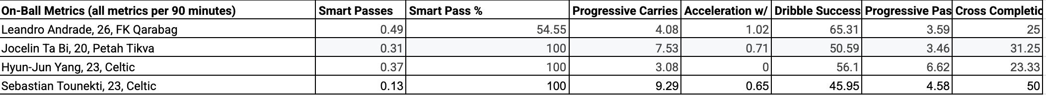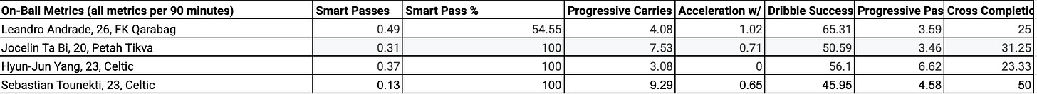 Comparing Andrade to Yang, Tounekti, and Ta Bi in the data sheet above, it is seen that Andrade is higher in Smart Passes p90, 3rd in Progressive carries, top in Accelerations w/ Ball, and has the best conversion rate in dribbling. He is, however, the 2nd lowest in Progressive Passes p90, but being top in Smart Passes makes up for that in a way. His Cross Completion % is low at 25%. The On-ball score is complicated as it takes in different aspects of a player’s game, passing, carrying, and crossing. Andrade is a decent passer, the best qualitative carrier, and around Yang’s level in cross completion %. Ta Bi has a good rate of Smart Passes p90 with 0.31. He is akin to Tounekti with his ability to carry the ball forward, being much higher than Andrade and Yang, and closer to Tounekti. His dribble success of 50.59% is only higher than Tounekti’s, but with an increase in carrying, you can assume there will be a decrease in Success rate. He is bottom of Progressive Passes p90 and close to Andrade and Yang in Cross Completion %. Ta Bi carries it a lot to a decent success rate, but no other metric really stands out here.