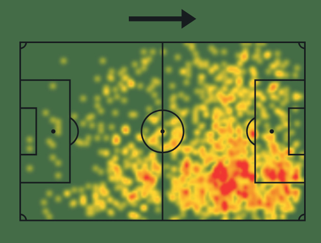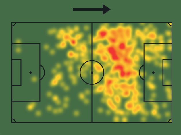 I mentioned Andrade’s top speed of 34.5 km/hr earlier, and his just under elite speed can be seen throughout the video. The best clip to evidence this is 2:09-2:17, where he bursts onto the ball and past two defenders, which ends with him coolly laying it off for his teammate and a goal that clinched Qarabag’s qualification for the Champions League. He does attempt to get in behind the defensive line, but it isn’t too frequent, largely down to the inverted role he is being asked to play most of the time.