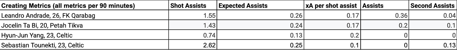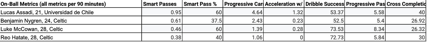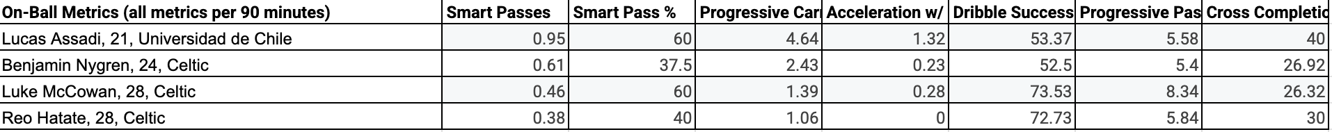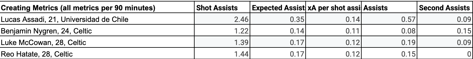 As seen in the scatter plot, Lucas Assadi is the 2nd-best creator in the data set, though quite a distance behind Aral Simsir. As Assadi is with his finishing, Andrade is slightly above the median line in creating. To further contextualize the players’ creative ability, I’ve compared them to current Celtic players of the same position.