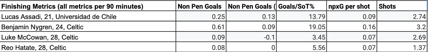 In the data sheet above, Assadi comes out as the 2nd-best finisher amongst current Celtic attacking midfielders, only behind Benjamin Nygren. Although Assadi’s Non-Pen Goals - npxG score is 0.04 higher than Nygren’s. Assadi does not take high-quality shots with 0.09 npxG per shot p90, but he is a decent finisher in relation to shot quality. Assadi is a slightly above-average finisher who needs to improve his finishing ability, but he is still much better than McCowan and Hatate.