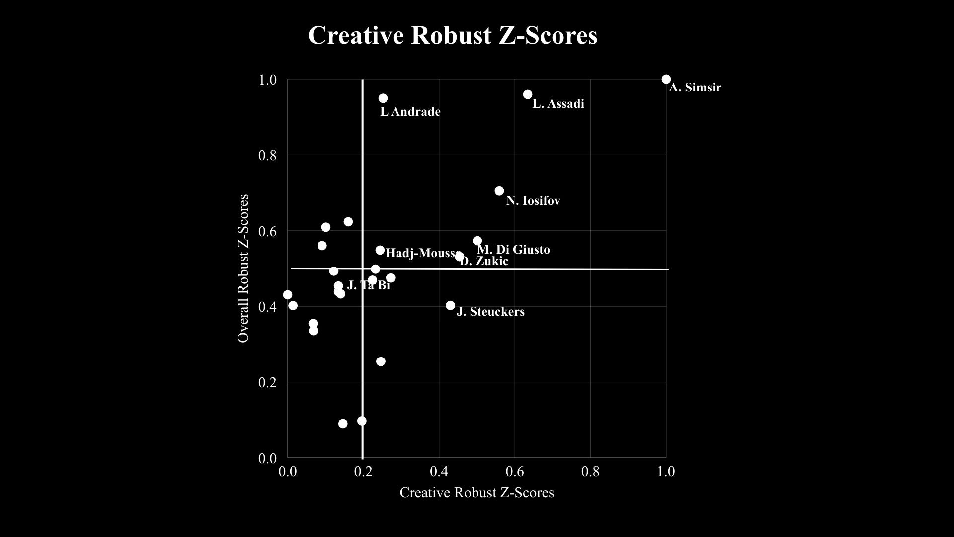 The scatter plot above compares the player’s “Overall Robust Z-score” (Y-Axis) to their “Creating Robust Z-Score” (X-Axis). Creating scores are weighted to the same degree as Finishing and On-Ball scores. To calculate this score, I weighted the Z-Scores for these metrics: