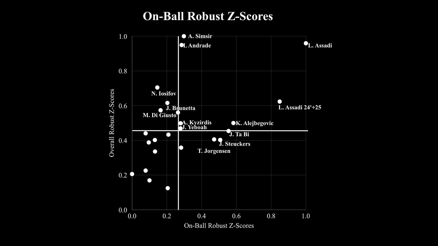 Lucas Assadi of Universidad de Chile and Leandro Andrade of FK Qarabag score very highly, and they are the two I will be focusing on. Assadi is a #10 preferring to pick up positions in the left half-space, which is a weakness for Celtic. Luke McCowan is not to the standard of a Celtic midfielder, and Reo Hatate is insanely inconsistent and can no longer be relied upon. Leandro Andrade is a Right Winger/#10, a very quick (ranking 25th in the Champions League for top speed at 34.5 km/h, tied with the likes of Kylian Mbappe!), versatile player with 3 goals in the Champions League this campaign. I will caveat that Leandro Andrade’s data is from the 2024-25 season, where he played most of his time at right wing. This season, he has been deployed as a 10, and his numbers have dropped. So, I am scouting him as a right winger with the ability to play in the 10 if need be. I am also going to add in a current Celtic transfer rumour in Jocelin Ta Bi, who ranks 17th in overall Robust Z-Score. Whilst in my Centre-Forward search, I compared three players for one position, I will treat my analysis of Assadi, Andrade, and Ta Bi as how they complement each other and how they improve weaknesses in the current Celtic squad. A different exercise, but one I still find coherent. So, let’s take a deeper look at the data of