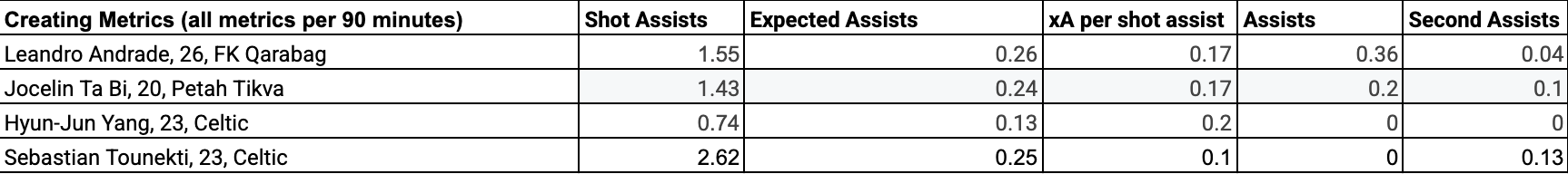 Andrade is well below Tounekti in Shot Assists but higher in Expected Assists and xA per Shot assist, and well above in Assists. Whilst Tounekti has been quite creative for Celtic, the finishing of his teammates has been poor with -0.25 Expected Assists minus Assists. Andrade is plus +0.10 in the same metric. However, with the improvement in finishing with Andrade and Centre-Forward targets in Jovan Milosevic or Tomas Bobcek, logically, this would increase the finishing quality of the team. Andrade creates a decent quantity of very quality chances. Ta Bi can be considered to be more creative than Yang (who must be noted has played considerable time at Right wing-back the last month), and just behind Andrade and Tounekti, given that Ta Bi generates a good amount of expected assists per 90 while retaining decent qualitative numbers with 0.17 xA per shot assist. Same as Yang and Tounekti, his teammates underperform his expected shot creations, though still at a better rate at -0.04. Celtic seems to be on the verge of running into a problem we already have: creative players who aren’t good finishers. This makes the signing of a goal-scoring 9 even more paramount if Ta Bi were to be signed.