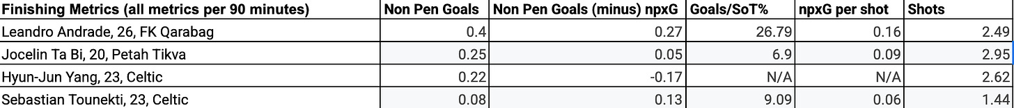 In the raw data sheet, Andrade is superior to Ta Bi, Yang, and Tounekti in every metric besides the least important: Quantity of Shots p90. I do not have Goals/SoT% for Yang as the data chart I gathered from turned him into a Right-Back (Thanks, Wilfried Nancy!) and does not provide those two metrics, though I do not expect them to be higher than Andrade. Andrade has an impressive Non-Pen Goals - npxG at 0.27 and a good conversion rate of 26.79%, which ranks 2nd in the whole data set. His qualitative metric of npxG per shot at 0.16 p90 is 4th in the whole data set. Andrade is a high-quality finisher, far better than the current Celtic wingers. Ta Bi, on the other hand, takes the most shots p90 with 2.95, overperforms his xG slightly, and scores the second highest Non-Penalty Goals p90. Concerns are with his Goals/SoT% being 6.9%— 40th overall in the data set, and his npxG per shot being at 0.09. Ta Bi looks to take a high quantity of shots but a low qualitative rate, which raises questions about his decision-making when shooting.