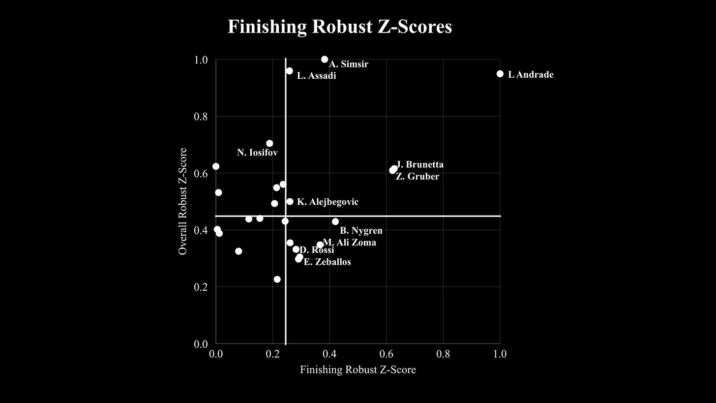 The scatter plot above compares the player’s “Overall Robust Z-score” (Y-Axis) to their “Finishing Robust Z-Score” (X-Axis). I weighted Finishing scores to the percentage degree as Creating and On-Ball scores.